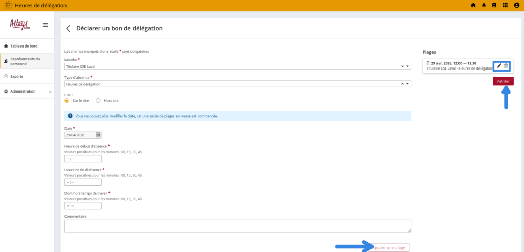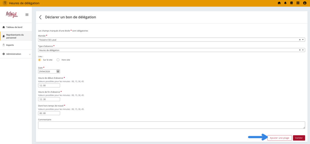 Une nouvelle fonctionnalité permet de saisir sur une même journée différentes plages horaires afin de créer facilement plusieurs bons selon les différents mandats de l'élu. A la création de la première plage horaire, il suffit pour l'élu de sélectionner “Ajouter une plage” pour pouvoir saisie un autre bon de délégation sur la date sélectionnée.