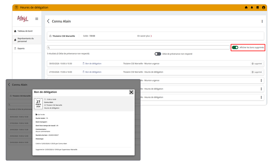 Grâce à l’historique des bons de délégation, vous bénéficiez d’une traçabilité complète et transparente de chaque événement qui impacte la vie d’un bon : depuis sa création, en passant par ses modifications, jusqu’à sa suppression.