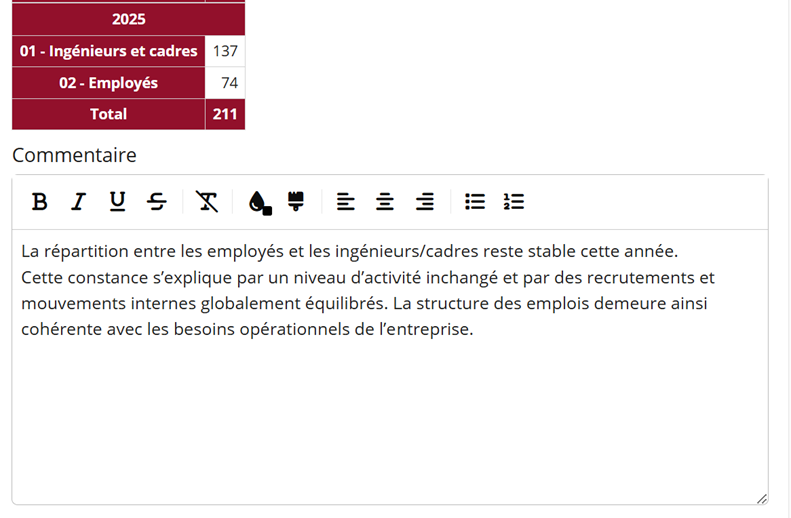 Pour chaque indicateur ayant des données, le déposant peut ajouter ses propres commentaires pour contextualiser le rapport.