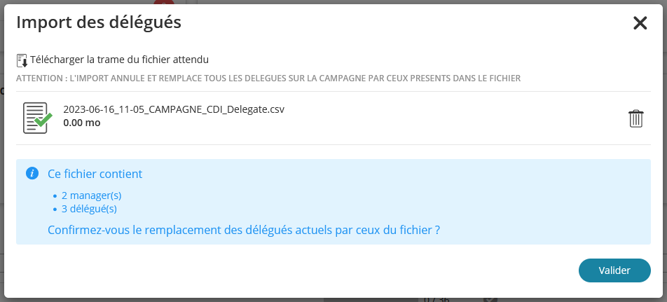 Avant l'import un message indique le nombre de managers et de délégués concernés. Veillez à vérifier que les chiffres vous semblent cohérent.