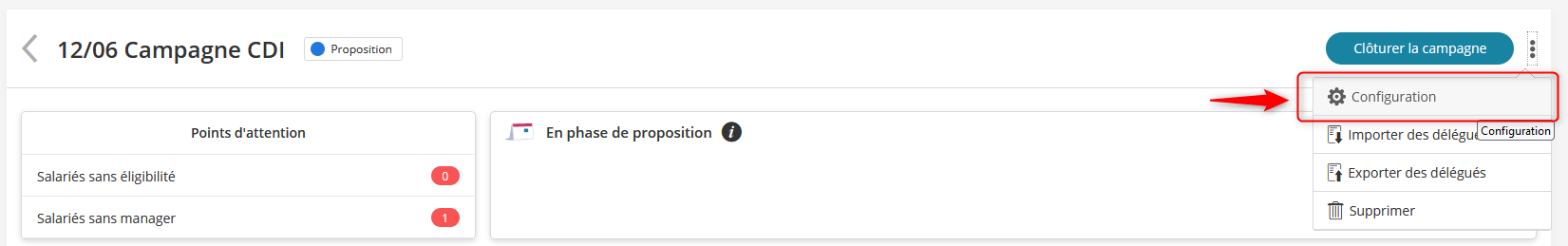 Dans la configuration de la campagne (depuis le menu “Actions” ou “…” de l'écran de campagne) :