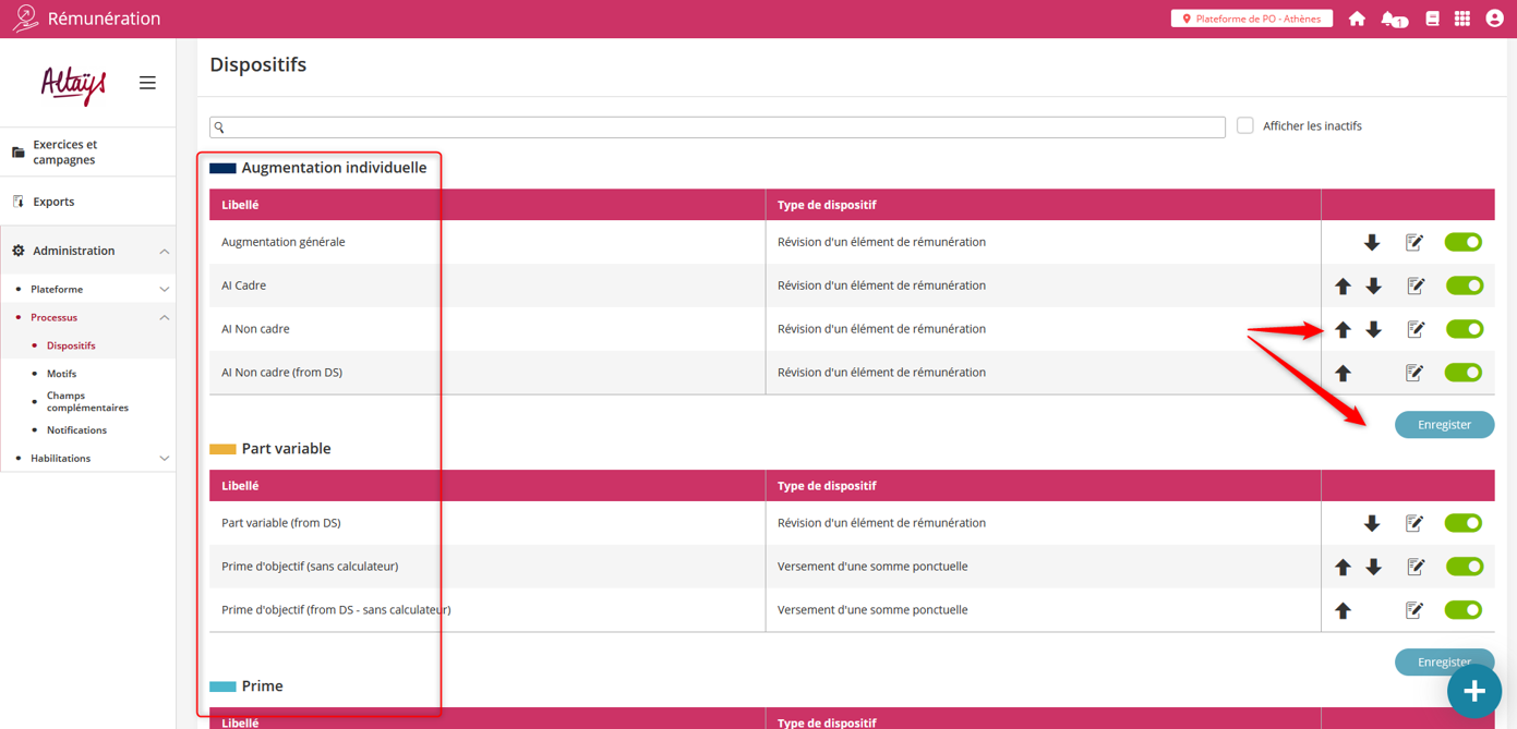 Les dispositifs ont été regroupés par catégorie de consolidation dans la page de paramétrage des dispositifs pour plus de lisibilité.