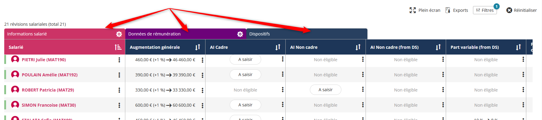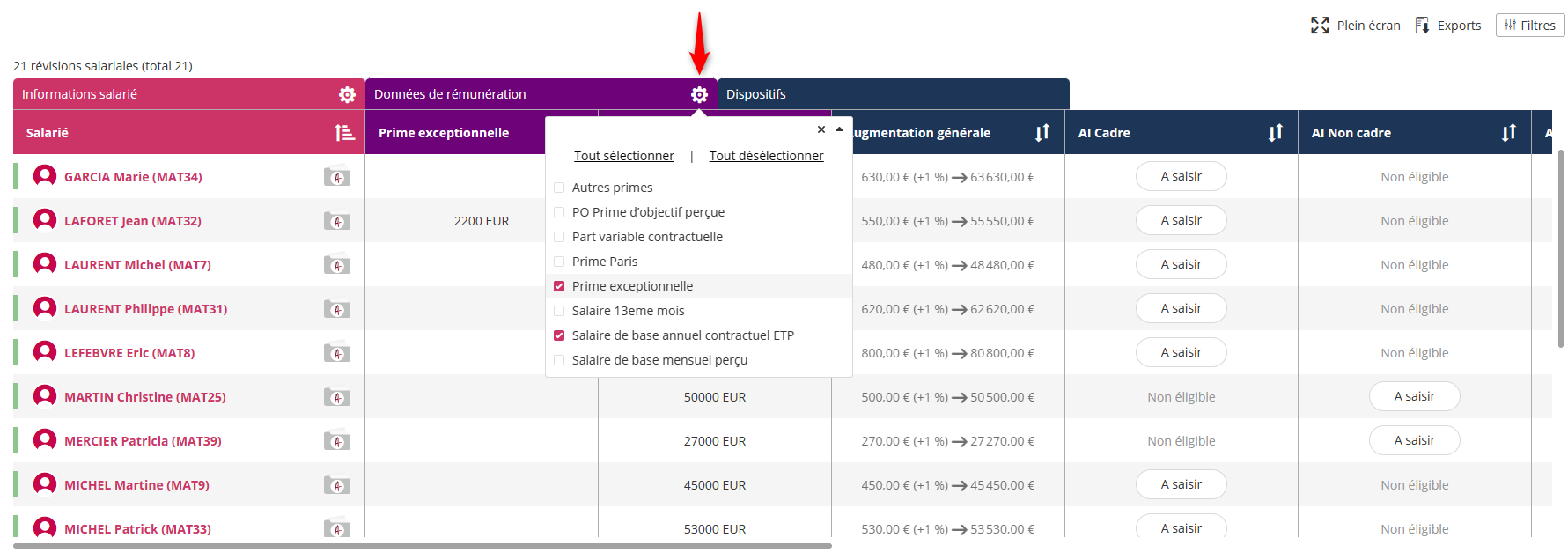 Des nouvelles colonnes ont été ajoutées dans les dispositifs de l’export des révisions salariales.