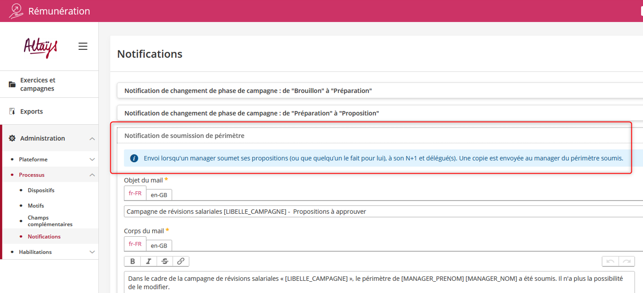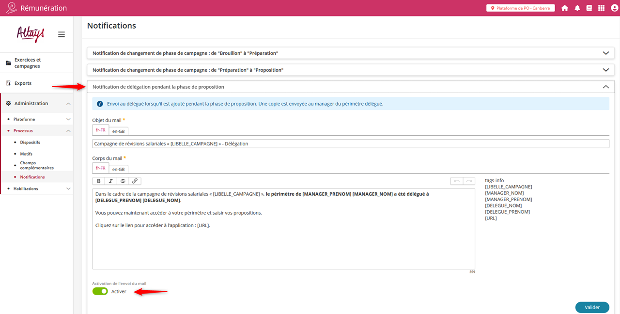 Lorsqu’un délégué est ajouté* en phase de proposition, envoi d’une notification par e-mail au délégué, avec copie au manager du périmètre délégué.