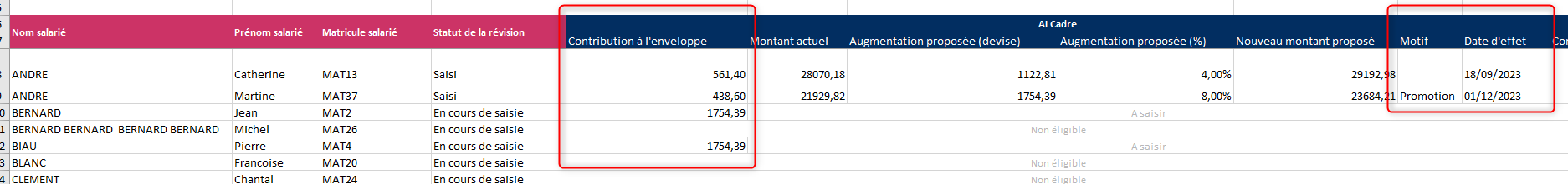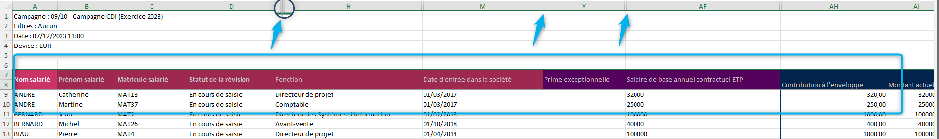 Ces colonnes sont disponibles dès la phase de préparation pour aider les acteurs RH à vérifier certaines données. Attention cependant, ces données (comme le reste du tableau) sont dans la devise d’affichage de l’utilisateur.