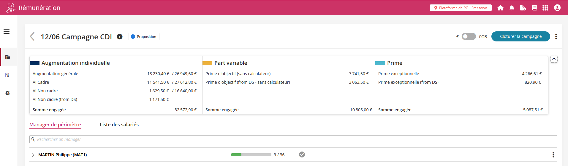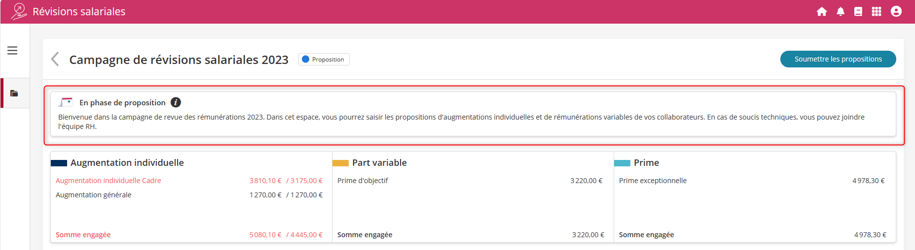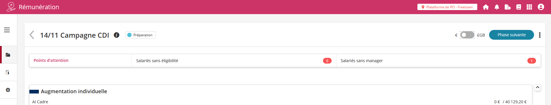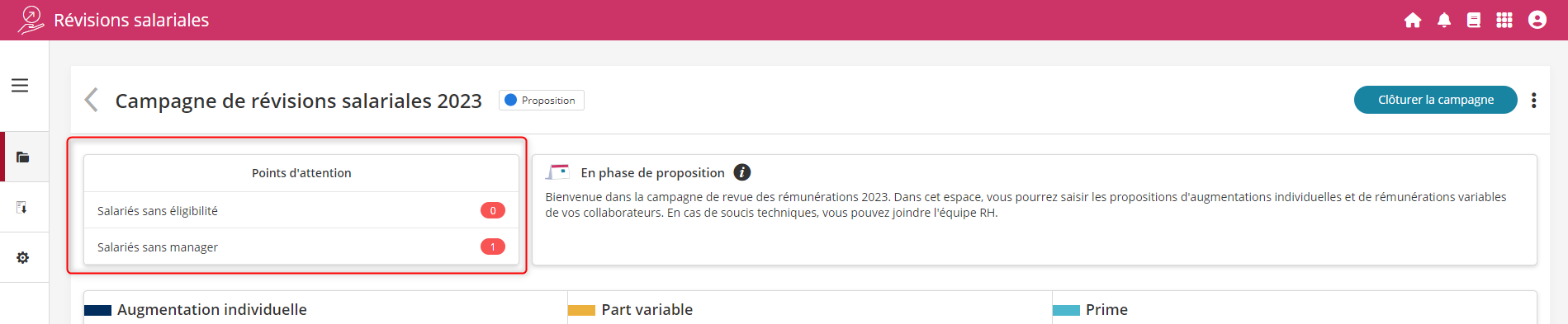 L'écran principal de la campagne a été optimisé pour faire le maximum de place au tableau des révisions salariales.