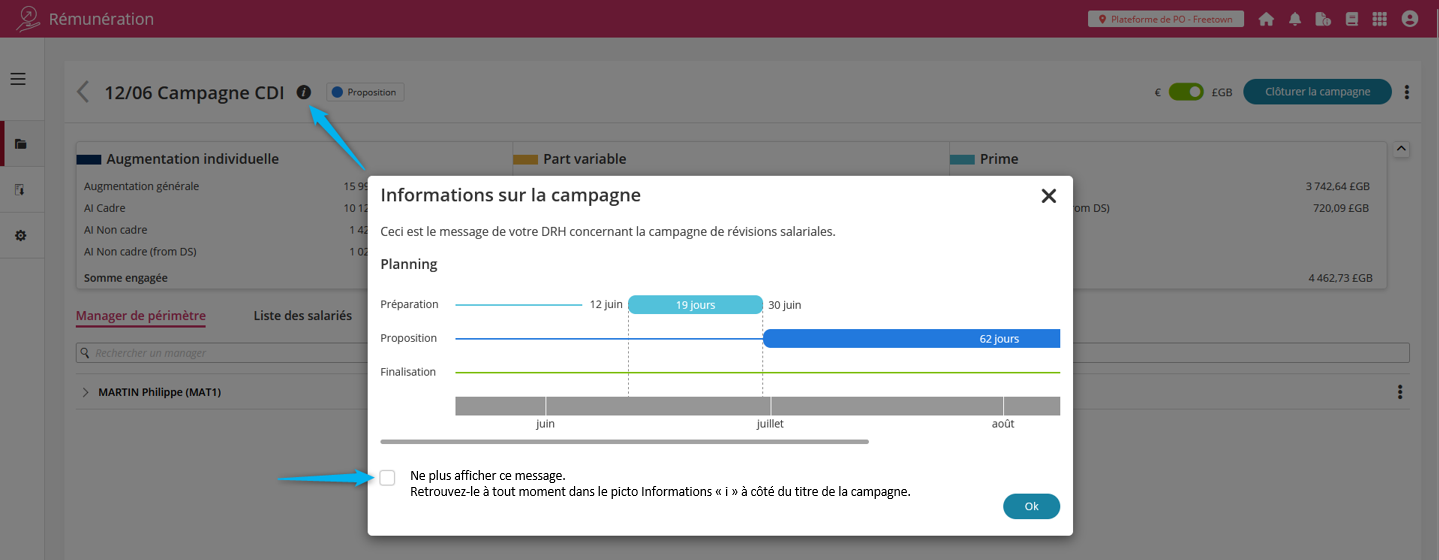 Pour ne plus qu’il s’affiche, il faut cliquer sur la case à cocher. Vous pourrez le retrouver à tout moment dans le picto d’informations “i” à côté du titre de la campagne.