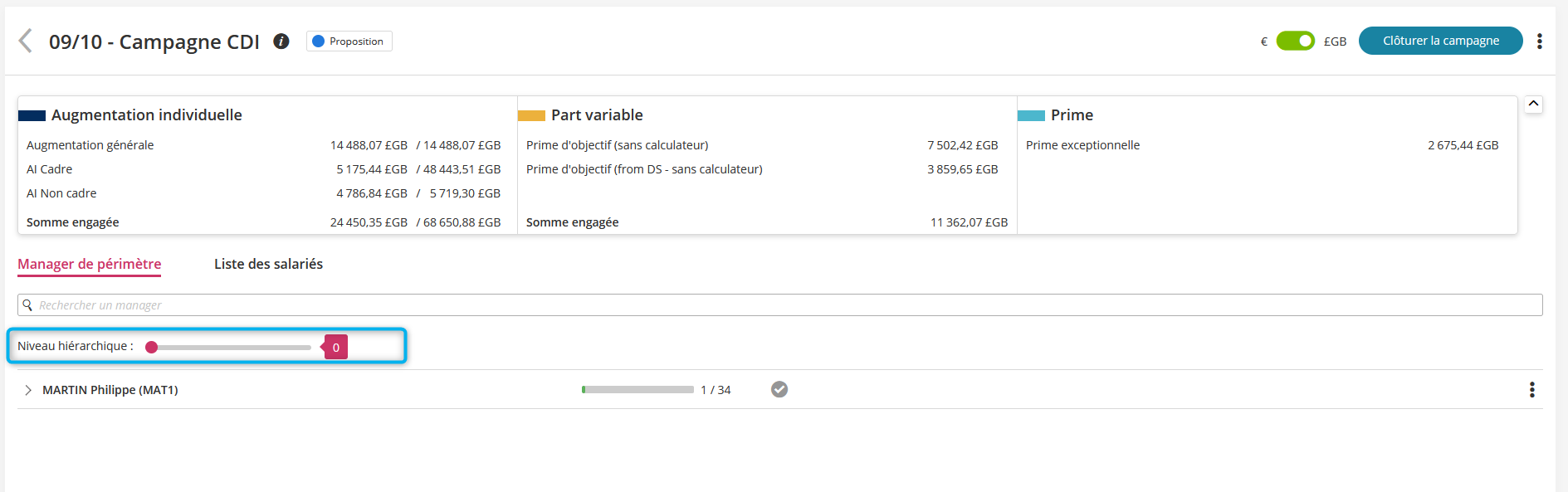 Pour des raisons de performance, le tableau des révisions salariales de la campagne est actuellement bridé par défaut à l’affichage de 100 salariés, et ce quel que soit le nombre de résultats renvoyé par la recherche. La plupart du temps, cet affichage de 100 salariés est suffisant pour la majorité des utilisateurs (managers, RH), mais nous savons que certains clients souhaitent tout de même pouvoir augmenter ce chiffre.