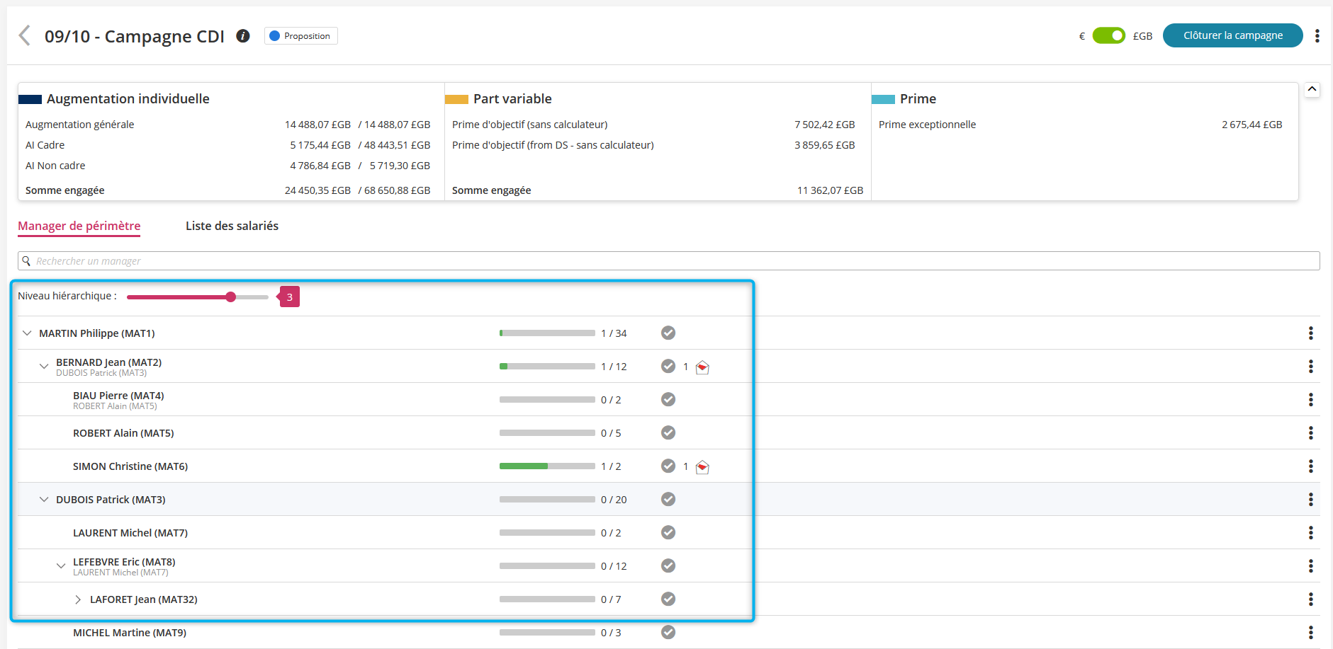 Cela concerne essentiellement les rôles administrateur et superviseur : ajout et suppression d'éligibilité sur le tableau de campagne, ainsi que les actions sur le tableau des révisions au fil de l’eau (cf. ci-dessus), mais celui d’un manager est quasiment identique au tableau actuel.