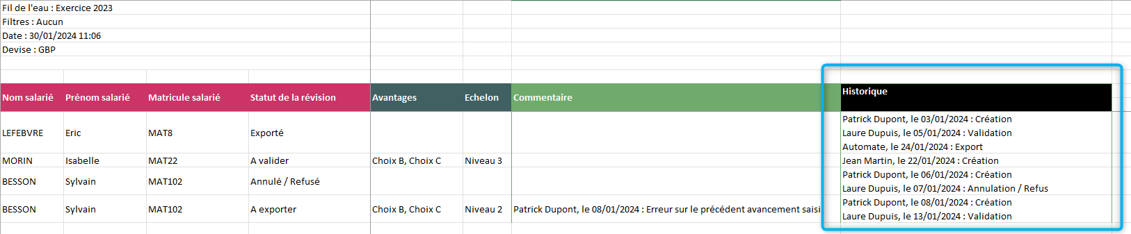 Des nouvelles colonnes ont été ajoutées dans l’export des révisions salariales au fil de l’eau.