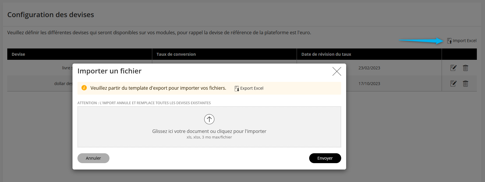 Depuis votre administration portail, vous pouvez désormais mettre à jour vos devises par import.