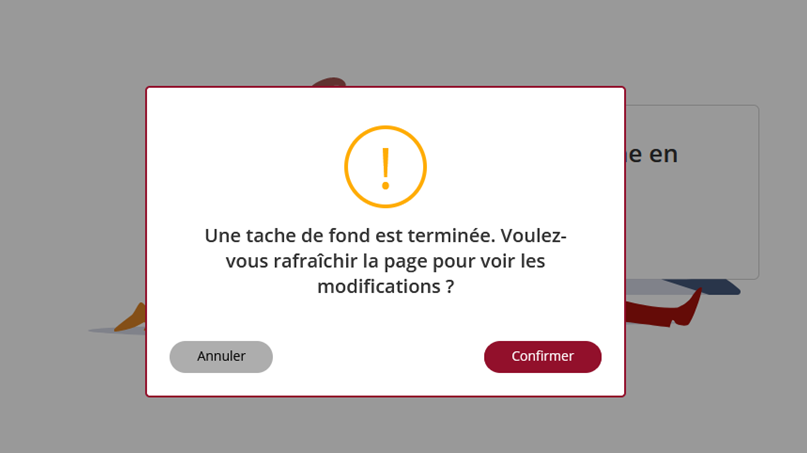 Lorsque le rechargement de la campagne est terminée, une pop-in de notification est affichée, vous demandant si vous souhaitez rafraîchir la page de campagne afin de bénéficier des données mises à jour.
