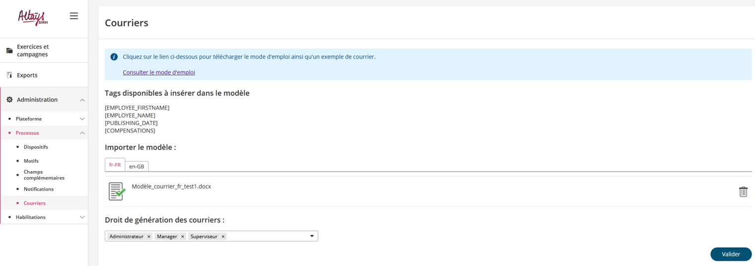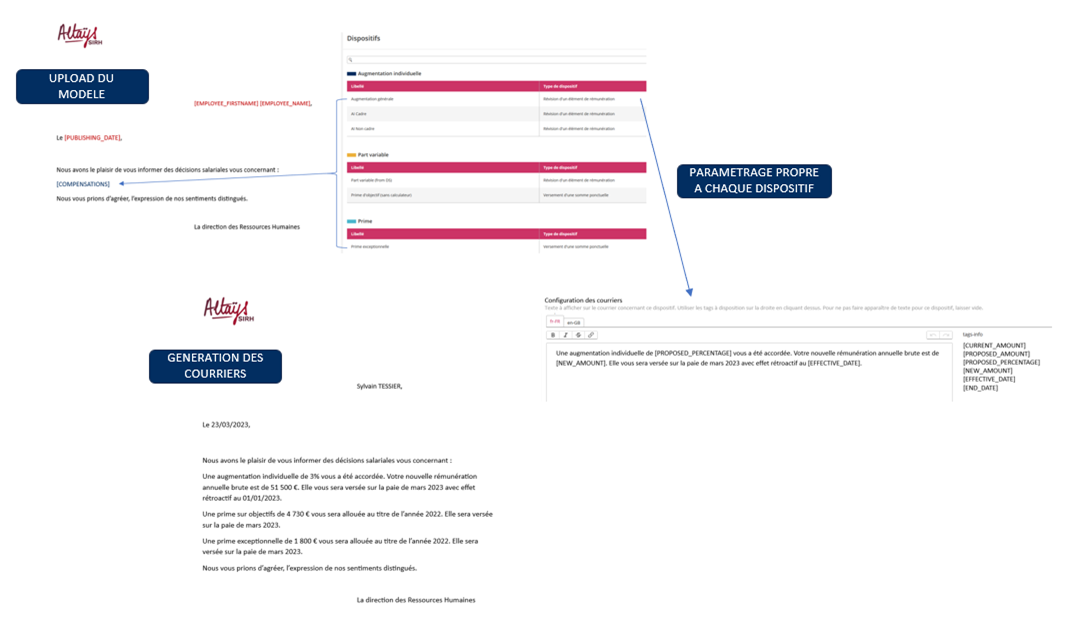 A partir de votre modèle au format Word, et d’un paramétrage à suivre pas à pas, vous pourrez autoriser vos managers (et délégués) et/ou responsable RH à générer des courriers en fin de campagne.