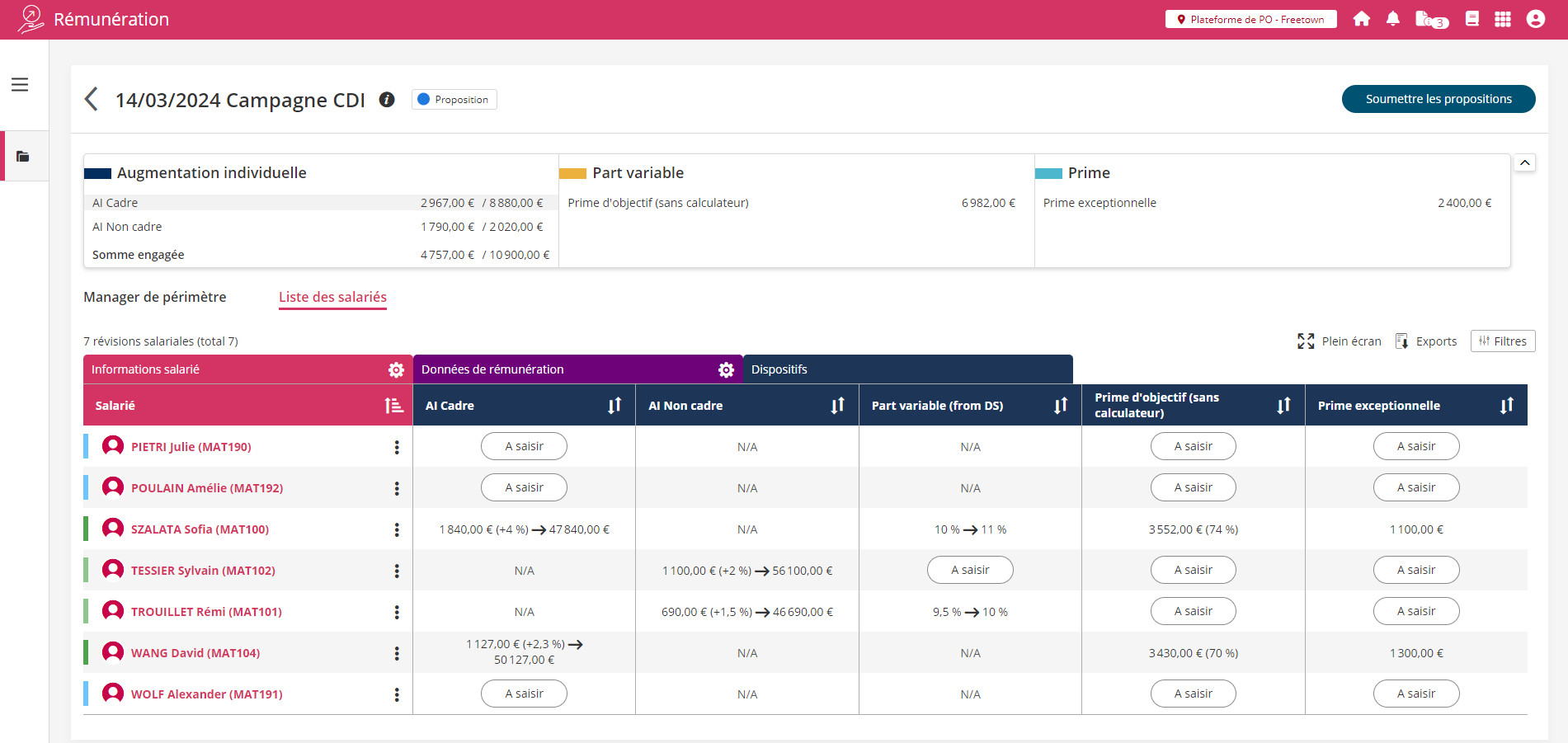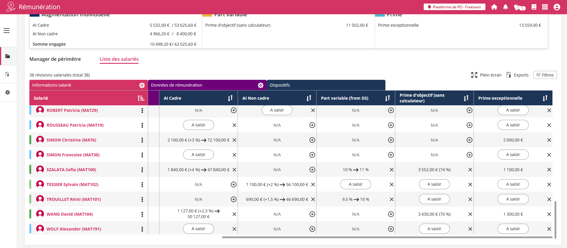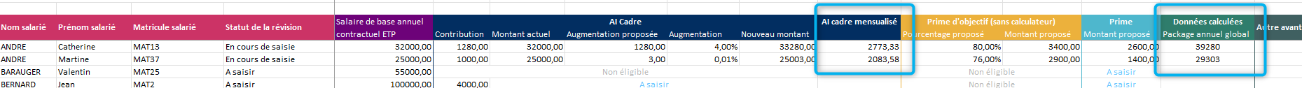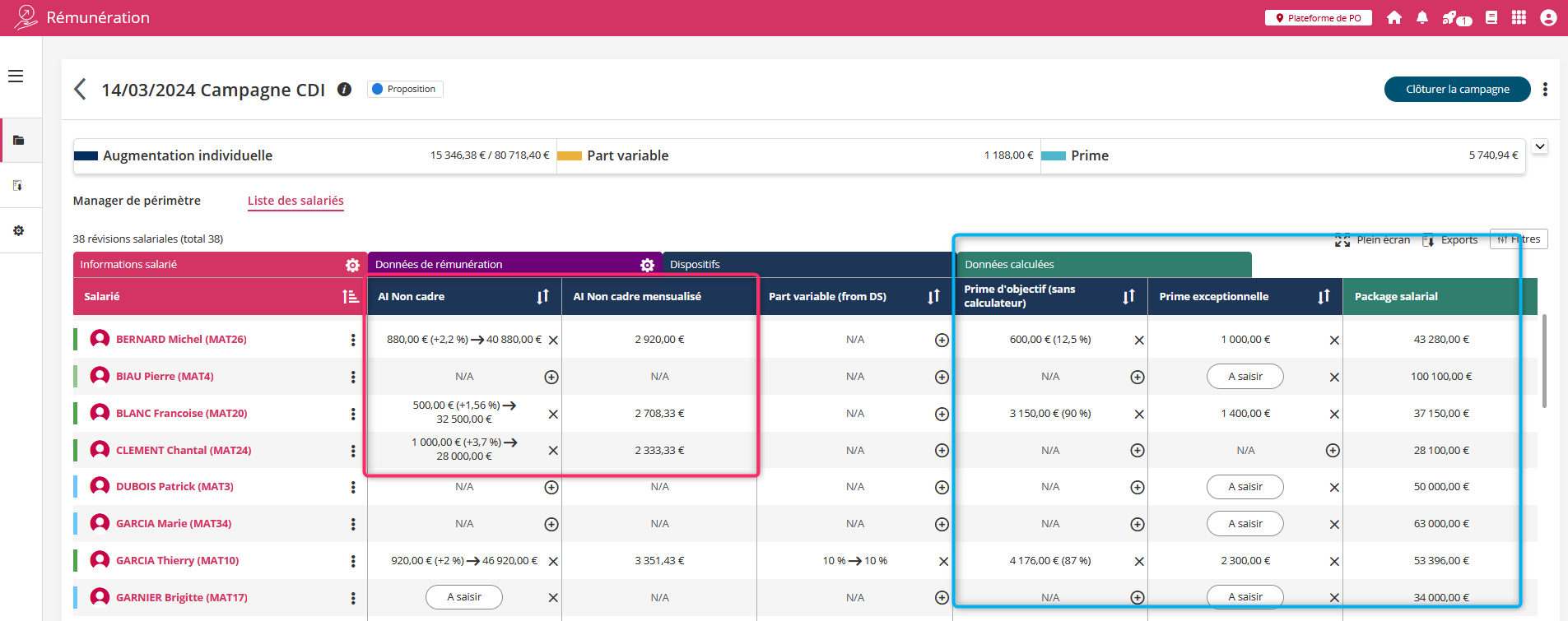 Dans le tableau des révisions salariales de campagne, vous avez désormais la possibilité d'ajouter des colonnes calculées personnalisées, telles que le calcul du package total d’un salarié. Ces colonnes peuvent être configurées selon vos besoins spécifiques.