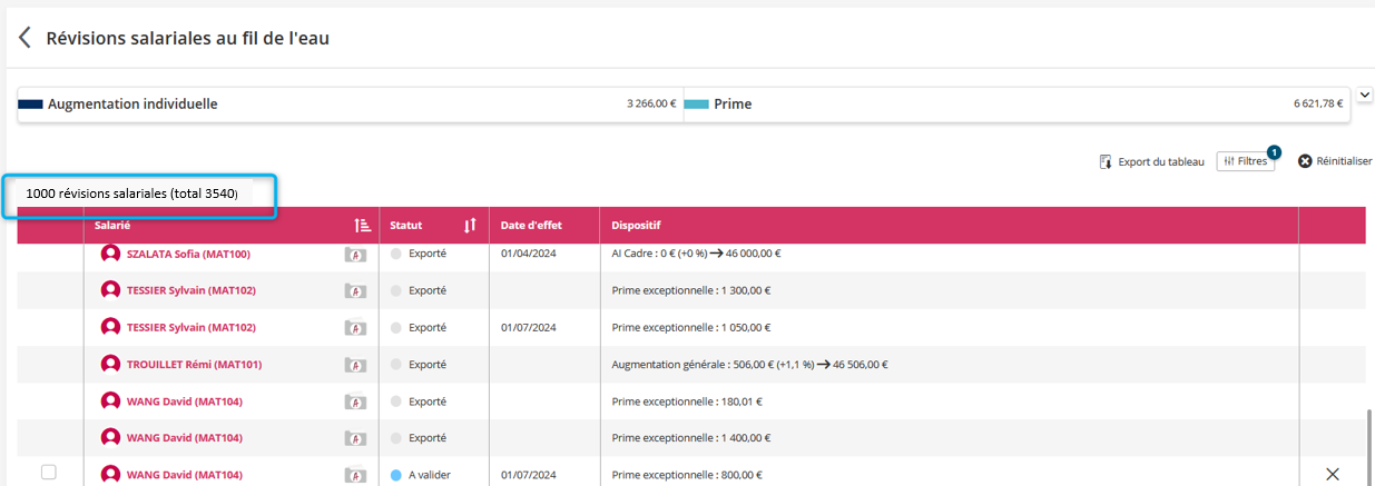 Pour optimiser votre expérience, nous avons ajusté l'affichage des révisions salariales en temps réel. Désormais, à l'instar de notre tableau de campagne, un maximum de révisions sera affiché par page (1000 par défaut), tout en indiquant le nombre total de résultats disponibles. Par exemple : 1000 révisions salariales (total 4618).
