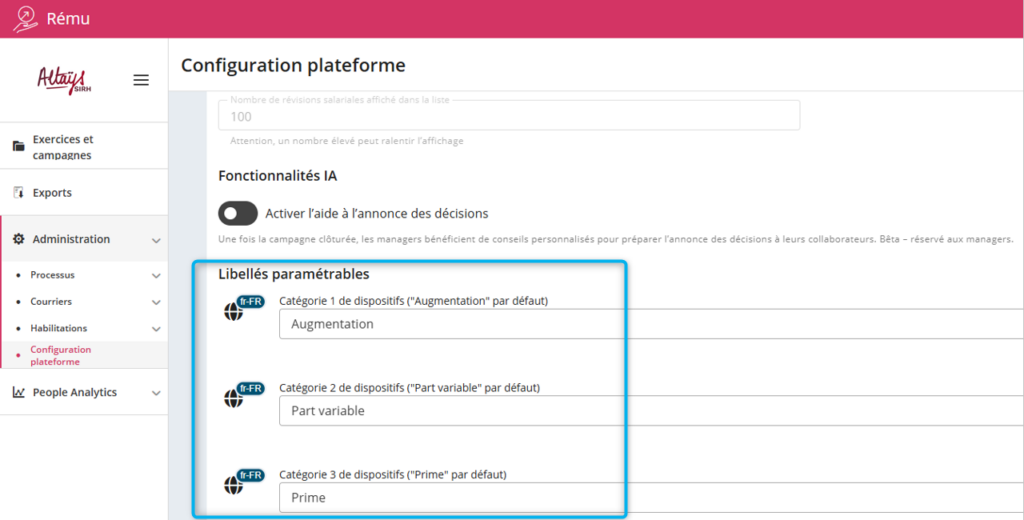 Depuis la nouvelle page Administration > Configuration plateforme, il est désormais possible de personnaliser les libellés des catégories selon vos besoins.