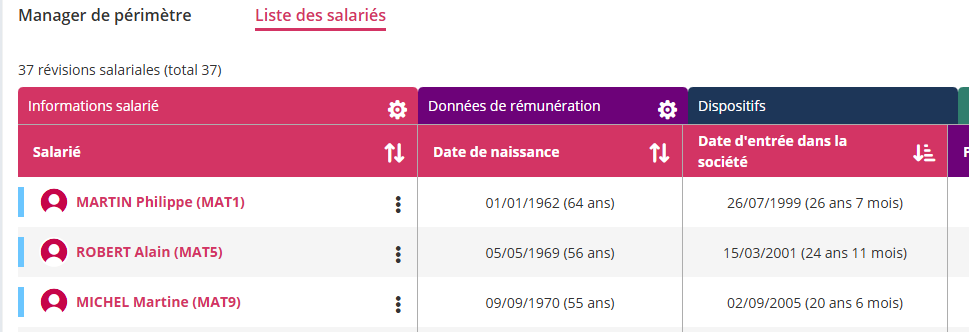 Dans le tableau des révisions salariales, les champs Date de naissance et Date d’entrée dans la société évoluent pour offrir une information plus directement exploitable.