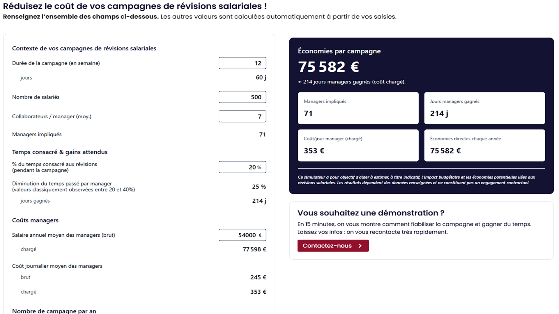 Pour vous permettre d’objectiver ces gains, une calculatrice ROI dédiée aux révisions salariales est désormais disponible. Vous renseignez votre contexte réel, durée de la campagne, nombre de salariés, nombre de managers impliqués, temps consacré aux révisions et niveau de rémunération managérial.